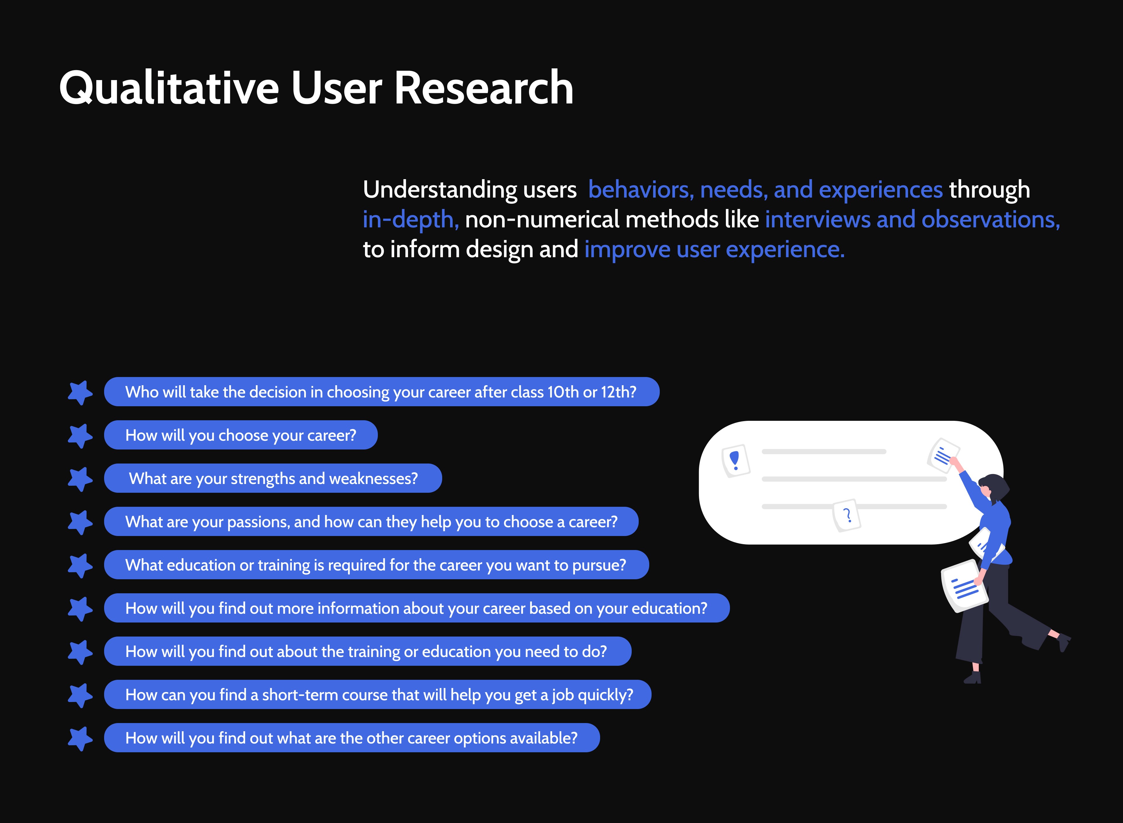 From psychometric research to conducting surveys and interviews to get to know about the necessary needs of the users. Focusing on the needs ,I worked on building a secure, result oriented design. Every step emphasized solving common user frustrations, like career uncertainty, lack of specific skill training, and outdated job market information.